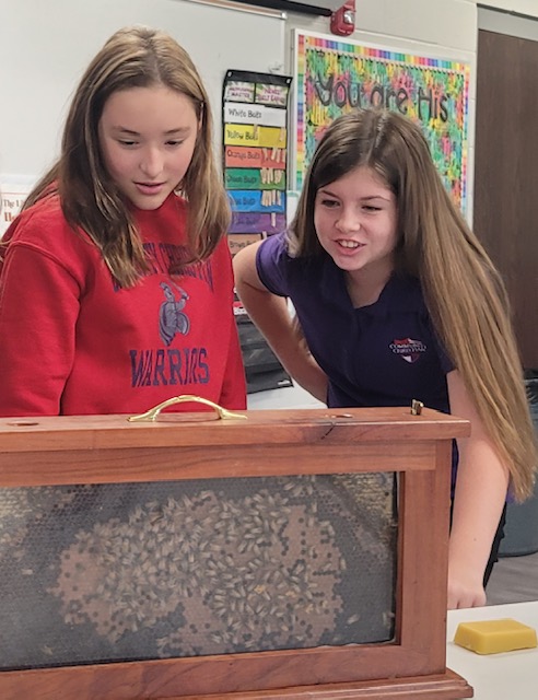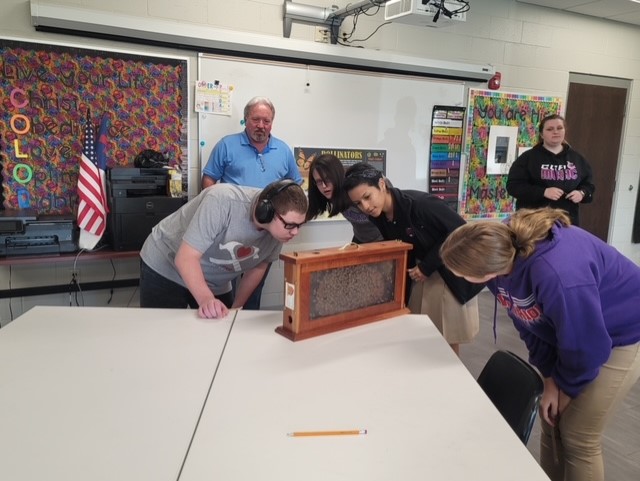 Mr. Chuck Collins, Bee-Keeper & owner of the Bee Barn, spoke to both our Middle & High School Agriculture classes about his experiences as a Bee-keeper & fun facts about honey-bees. Mr. Collins brought with him a live honey-bee frame, a bar of bees wax, one pound of honey from his hives & honey straws for our students to try a taste of local honey. Agriculture students have been researching pollinators, such as the honeybee; how they pollinate, what they pollinate, threats to each, and whether the pollinators migrate or hibernate. #Fun fact: did you know that honeybees are not native to North America? Christopher Columbus actually brought honeybees over on his voyages and their scientific name is the European honeybee. We appreciate Mr. Collins taking the time to visit with our Agriculture classes & sharing his very valuable knowledge & experiences with us! #ageducation